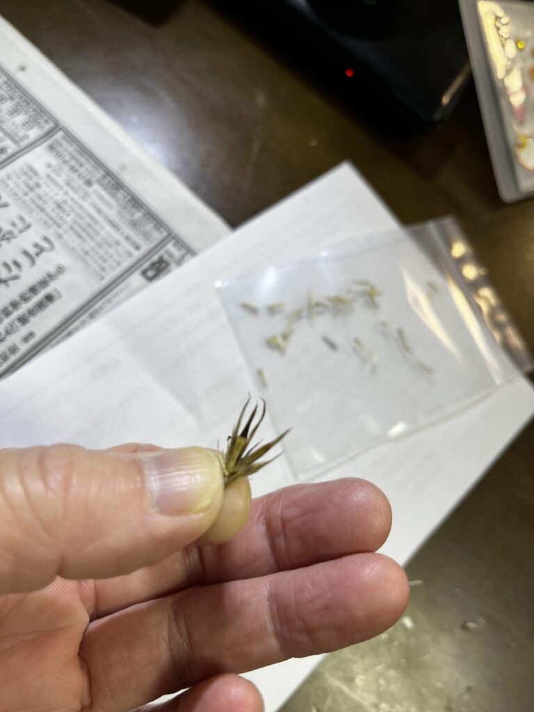 ☆中画像 ルリタマアザミの種は、とげとげした一つ一つの房の中に入っています。まわりの皮?をはいであげると、中から種が顔を出します。