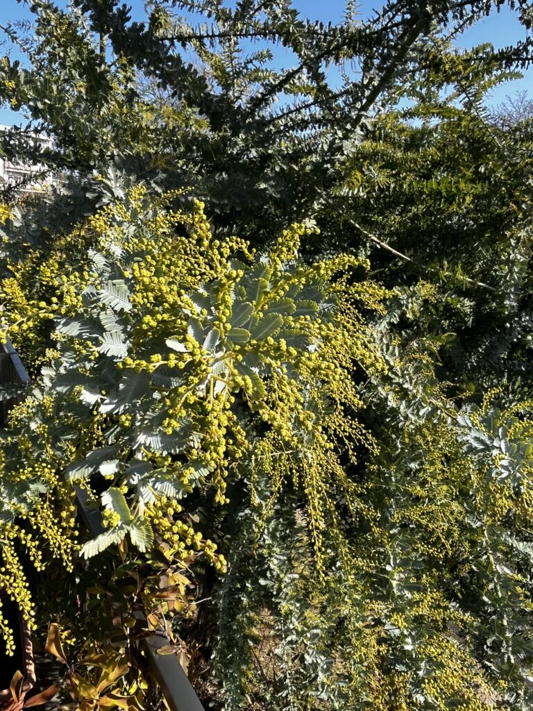 ミモザの花芽は枝の下の方から開花していきます。わたしたちにとっては枝の先の方から開花してくれた方が都合がよいのですが、うまい具合にはいかないものなのです。