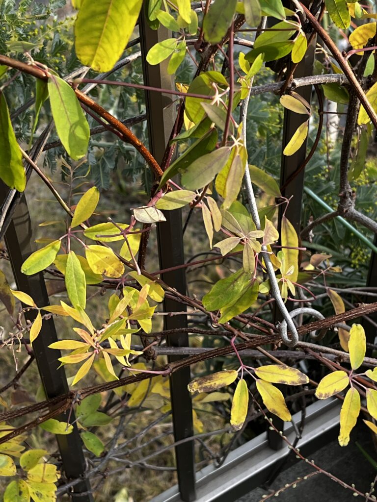 ようやく、フェンスに伝わり始め、いつかアケビの実をつけることでしよう。