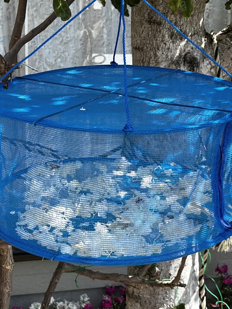なお、グリセリンにつけて置く作業の際、どうしても花びらが落ちてしまったり、弱い枝がおれてしまったります。そうした小さな枝や花びらも左画像のようなかごを使って干すようにしています。