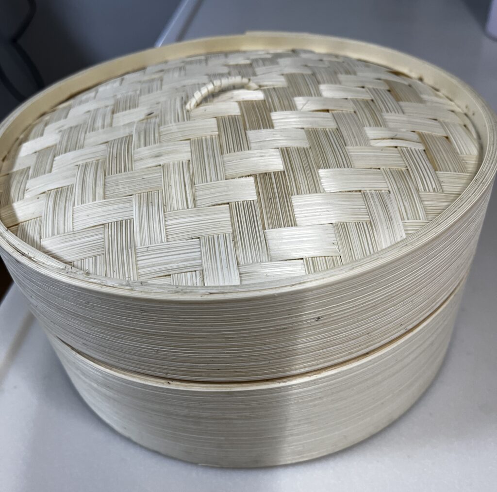 最近、せいろを使った料理の話題をよく耳にするようになりました。元来、目新しいものに飛びつく傾向の強いわたしとしては、実際に試したくなるのです。そこで、さっそくニトリにでかけてせいろを購入した次第です。蓋つき一段で竹製、約600円とたいへんリーズナブルでした。