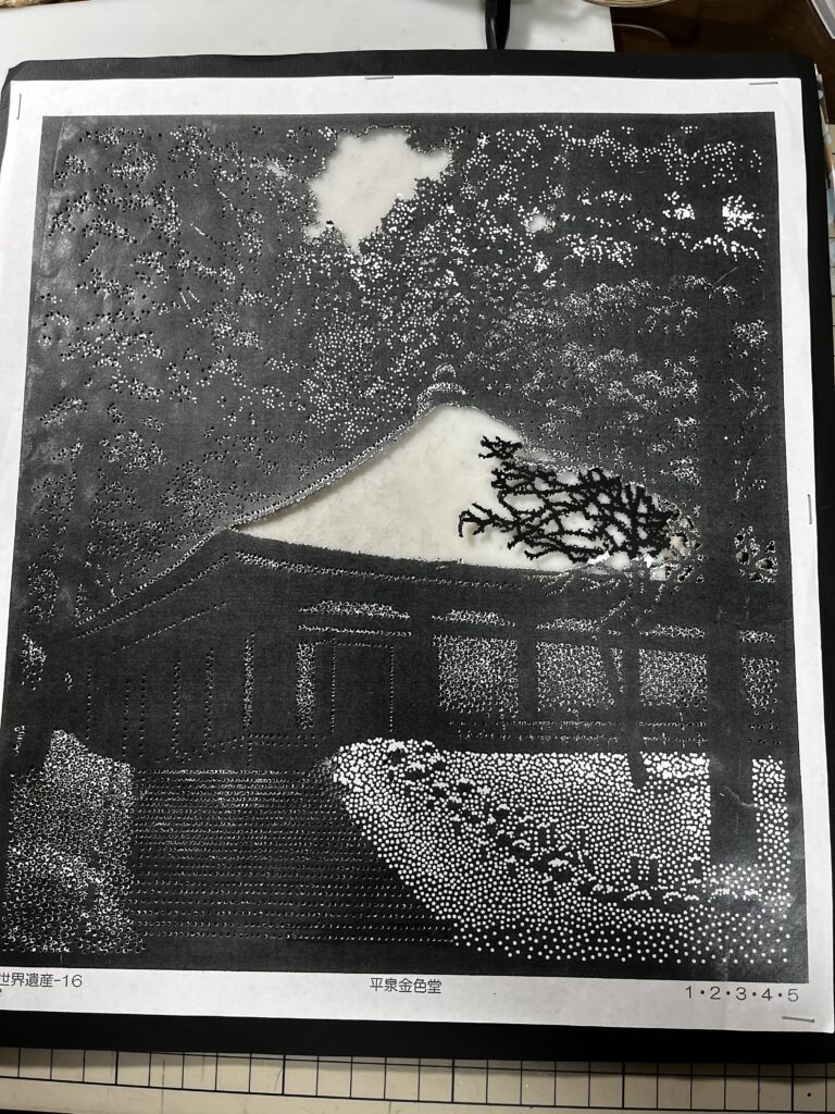 インターネットで「伊勢型紙専門店 おおすぎ」を見つけ、切り絵の下絵を3枚購入しました。「京都 天竜寺の庭園」「中尊寺金色堂」「北海道 知床半島」の3枚の図柄です。